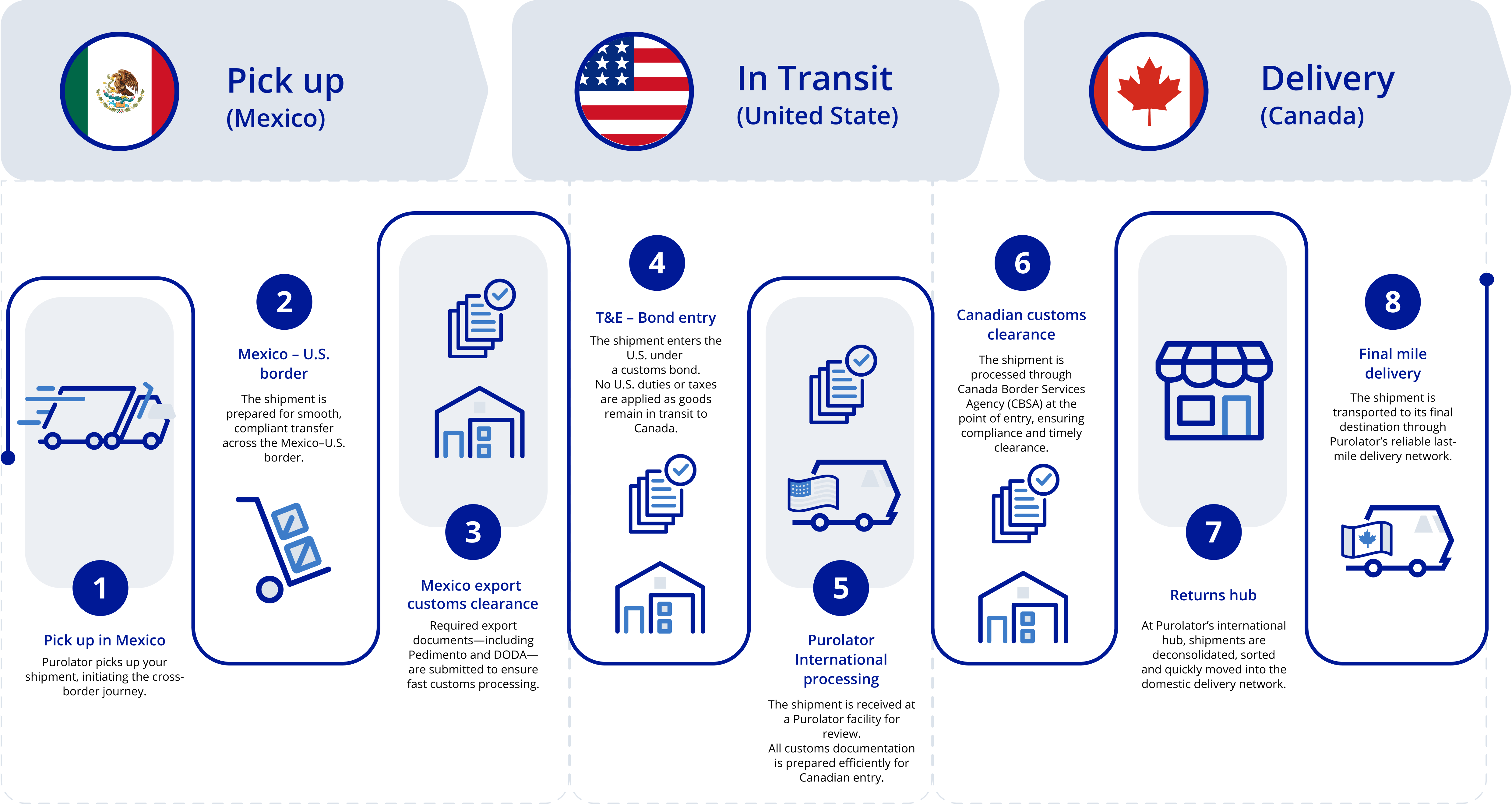 With decades of cross-border expertise, Purolator can ship from Mexico to any Canadian postal code. Turn to us for full customs support and on-time shipments.